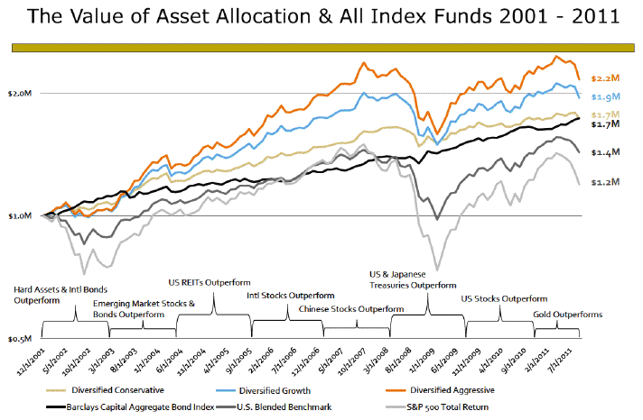 Small investors simply can’t afford to be wrong for a decade. They would be wiped out in just a few months on such singular bets on asset classes. Rather, if you had held a portfolio of index funds or ETFs of the six major asset classes since 2000, rebalanced regularly, collected your dividends, and (here’s the key) turned off CNBC, you would have done great.